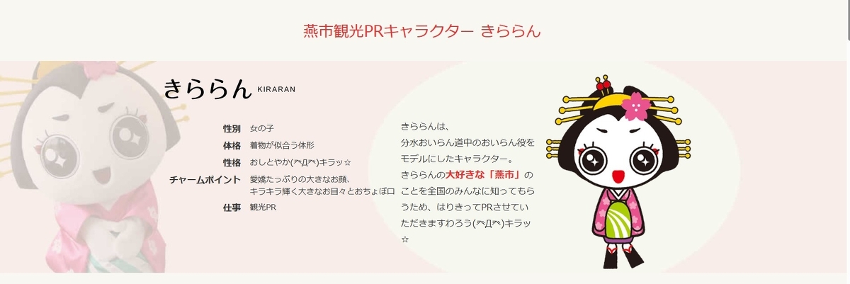 ~きららん散歩~ 燕市の観光PRキャラクターきららんが燕市のいろいろなスポットを紹介♪ 春はもちろん、年間とおして楽しめる燕市! ぜひ、燕市へ遊びにお越しくださいでわろう♪ 下記画像からアカウントへいってらっしゃいですぅ~ アカウントはこちら↑