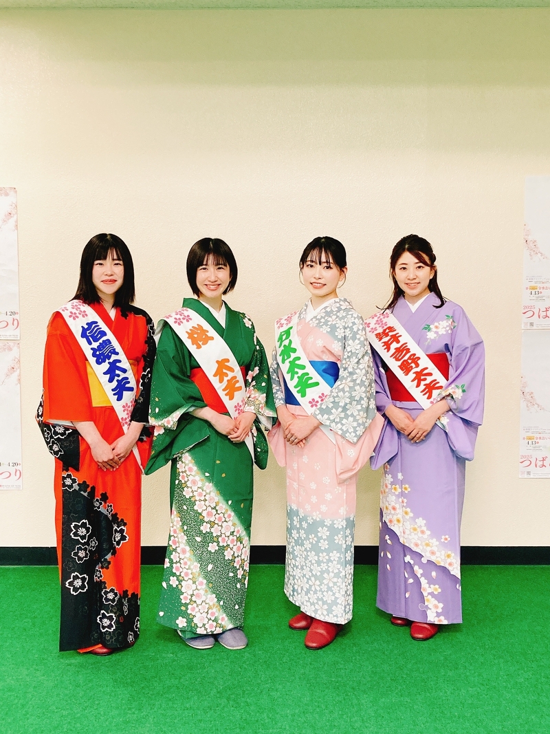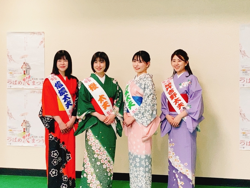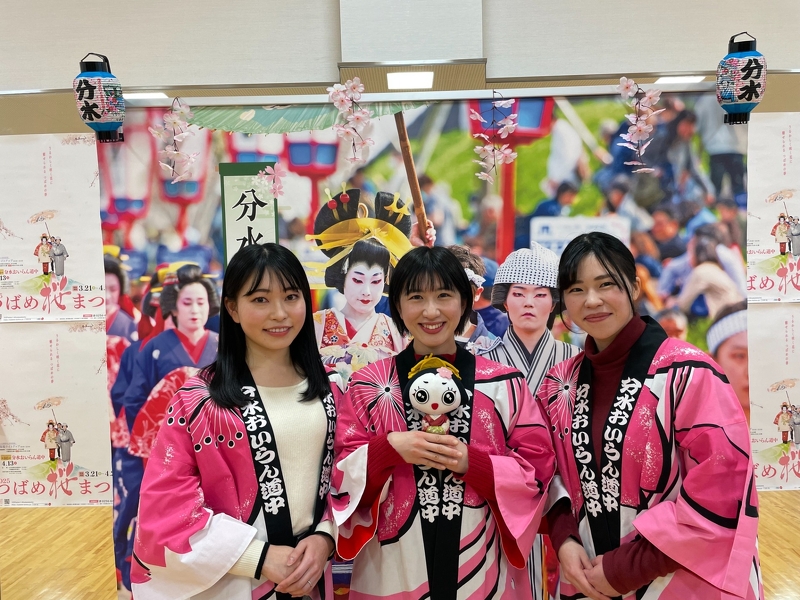 今年のおいらん役3名! 左から①長谷川 瑞姫さん ②星野 真衣さん ③佐藤 千幸さん ④BSN三石 佳那さん 当日は絢爛豪華な衣裳に身を包み、高さ15センチもの三枚歯黒塗りの高下駄を履いて、おいらん独特の歩き方「外八文字」を披露。 58人の付き人を従え、地蔵堂本町通りと大河津分水桜並木の2カ所を総勢61名で練り歩きます! おいらん役のご紹介(左から) ・長谷川 瑞姫さん<信濃太夫:燕市在住> ・星野 真衣さん<桜太夫:東京都在住> ・佐藤 千幸さん<分水太夫:三条市在住> ・三石 佳那さん<染井吉野太夫:BSNアナウンサー>