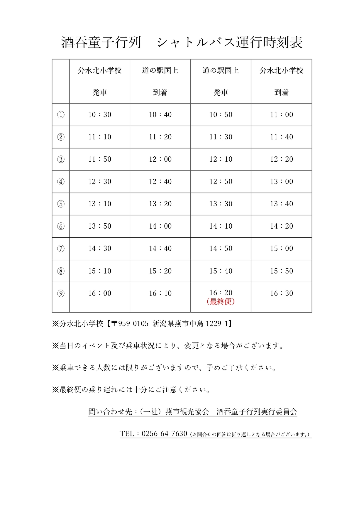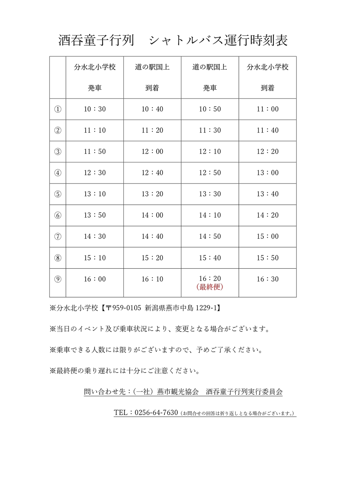 9/28酒呑童子行列当日に、シャトルバスを運行いたします。 会場となる道の駅SORAIRO国上と分水北小学校間を往復しますので、是非ご利用ください! (分水北小学校:〒959-0105 新潟県燕市中島1229-1) ※乗車できる人数には限りがございますので、予めご了承ください。